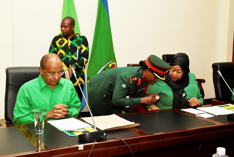 RAIS wa Zanzibar na Mwenyekiti wa Baraza la Mapinduzi ambae pia ni Mjumbe wa Kamati Kuu ya Halmashauri Kuu ya CCM Taifa Mhe.Dk.Hussein Ali Mwinyi, akisoma kabrasha kabla ya kuaza kwa Kikao cha Kamati Kuu ya CCM kilichofanyika katika ukumbi wa Jakaya Kikwete Dodoma na (kushoto kwake ) Rais wa Jamuhuri ya Muungano wa Tanzania ambae pia ni Mjumbe wa Kamati Kuu ya Halmashauri Kuu ya CCM Taifa Mhe. Samia Suluhu Hassan, wakiwa katika ukumbi wa mkutano wa Jakaya Kikwete Dodoma