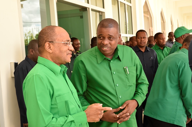 RAIS wa Zanzibar na Mwenyekiti wa Baraza la Mapinduzi ambae pia ni Mjumbe wa Kamati Kuu ya Halmashauri Kuu ya CCM Taifa Mhe.Dk.Hussein Ali Mwinyi akizungumza na Mjumbe wa Halmashauri Kuu ya CCM Taifa ambae pia ni Makamu wa Pili wa Rais wa Zanzibar Mhe. Hemed Suleiman Abdaulla, wakibadilishana mawazo wakiwa nje ya ukumbi wa Jakaya Kikwete Dodoma baada ya kumalizika kwa Kikao cha Kamati Kuu ya CCM kilichofanyika leo 30-3-2021 Dodoma.(Picha na Ikulu)