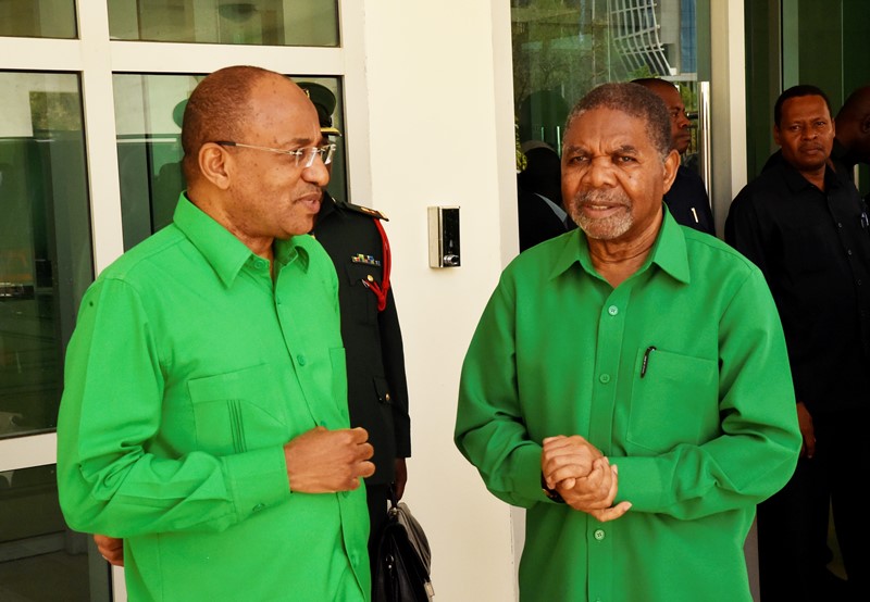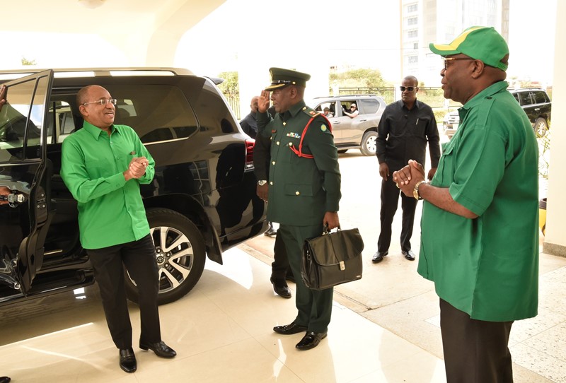 /RAIS wa Zanzibar na Mwenyekiti wa Baraza la Mapinduzi ambae pia ni Mjumbe wa Kamati Kuu ya Halmashauri Kuu ya Taifa Mhe.Dk.Hussein Ali Mwinyi akizungumza na Makamu Mwenyekiti wa CCM Zanzibar Mhe.Dkt.Ali Mohamed Shein wakiwa nje ya ukumbi wa Jakaya Kikwete Dodoma, baada ya kumalizika kwa Kikao cha Kamati Kuu ya CCM, kilichofanyika leo Jijini Dodoma