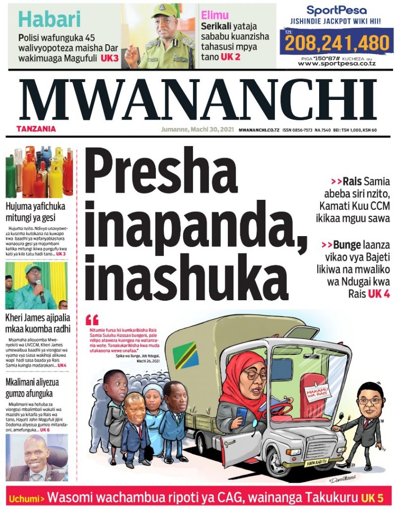 MagazetiPITIA VICHWA VYA HABARI KATIKA MAGAZETI YA LEO MARCH 30,2021 Last updated: 2021/03/30 at 2:26 AM Alex Sonna 5 years ago Share SHARE Alex Sonna March 30, 2021 March 30, 2021 Share this Article Facebook Twitter Email Print Previous Article WIZARA YA HABARI, KAMATI YA BUNGE WAKUBALIANA KUSUKUMA MAGEUZI TASNIA YA FILAMU Next Article PONGEZI KWA RAIS MAMA SAMIA SULUHU HASSAN ZATOKA UJERUMANI
