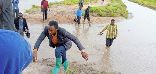 Naibu Waziri wa Nchi ofisi ya Waziri Mkuu, Kazi, Vijana na Ajira, Patrobas Katambi ambaye pia ni Mbunge wa Jimbo la Shinyanga Mjini (CCM) akiwa katika barabara inayounganisha kijiji cha Uzogore na Bugwandege ambayo imekatika kutokana na mvua zinazoendelea kunyesha