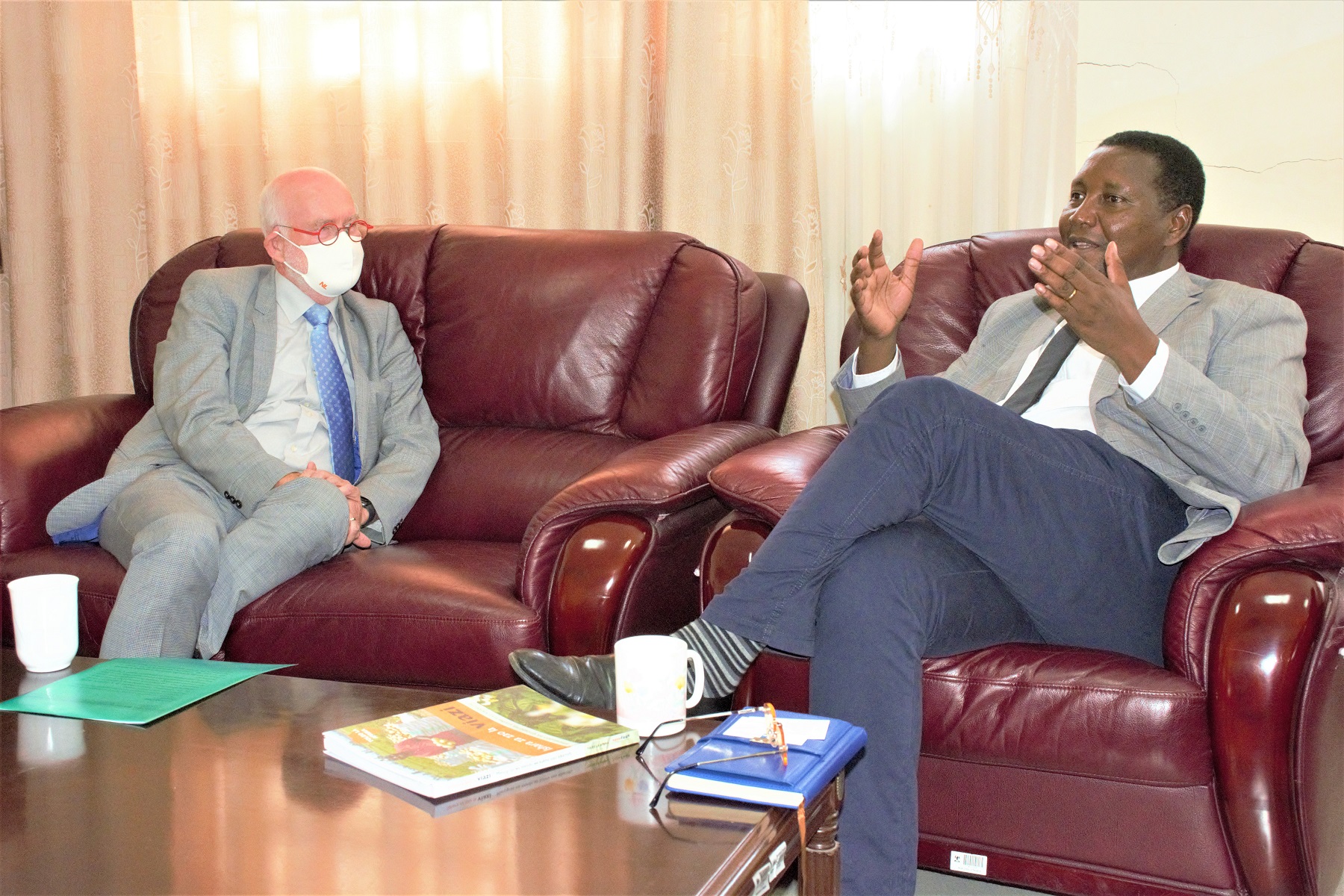 Waziri wa Kilimo Prof. Adolf Mkenda akifanya mazungumzo na mgeni wake Balozi wa Uholanzi nchini Jeroen Verheul ofisini kwake Wizara ya Kilimo Jijini Dodoma