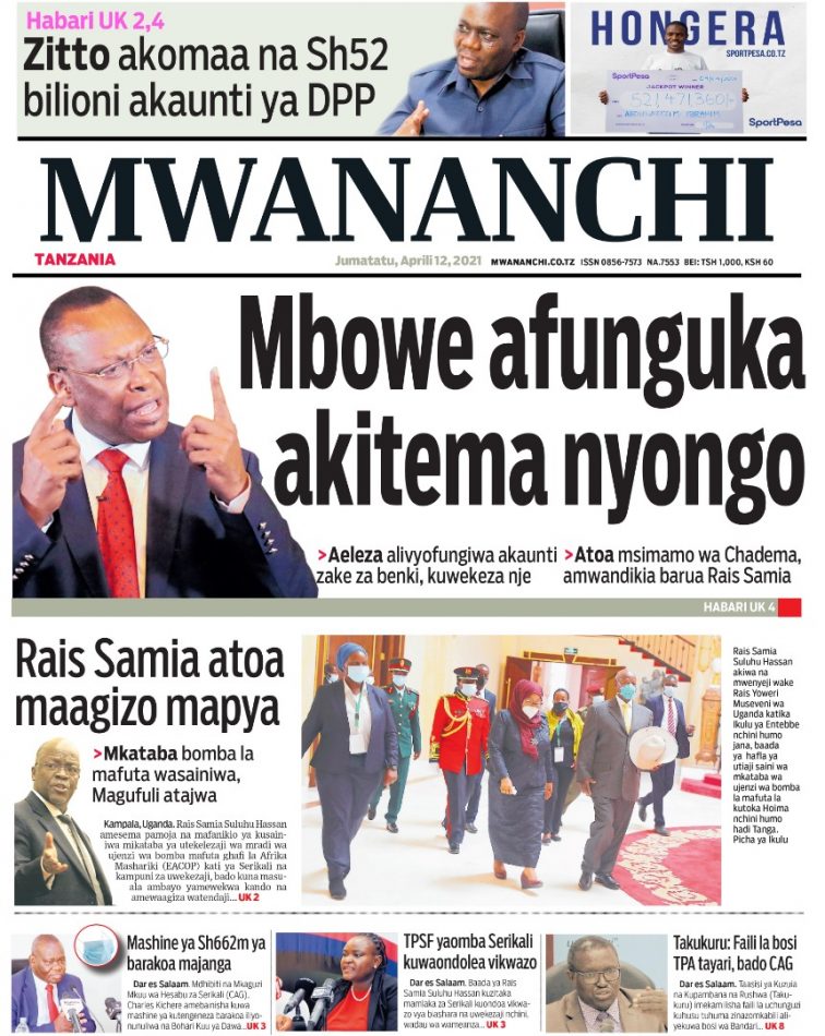 MagazetiPITIA VICHWA VYA HABARI KATIKA MAGAZETI YA LEO APRIL 12,2021 Last updated: 2021/04/12 at 2:50 AM Alex Sonna 5 years ago Share SHARE Alex Sonna April 12, 2021 April 12, 2021 Share this Article Facebook Twitter Email Print Previous Article BARABARA YA HAYDOM-MBULU KUJENGWA KWA LAMI Next Article WALIMU MWANGA WAPONGEZWA KWA KUFANYA KAZI KWA NIDHAMU NA WELEDI