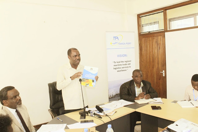 Mkurugenzi Idara ya Udhibiti uchumi Tasac Nahson Sigalla kushoto akimkabidhi Mkuu wa Mkoa wa Tanga Martine Shigella kitabu chenye mpango wa wa Taifa wa kujiandaa na umwagikaji wa mafuta kwenye bahari na maziwa