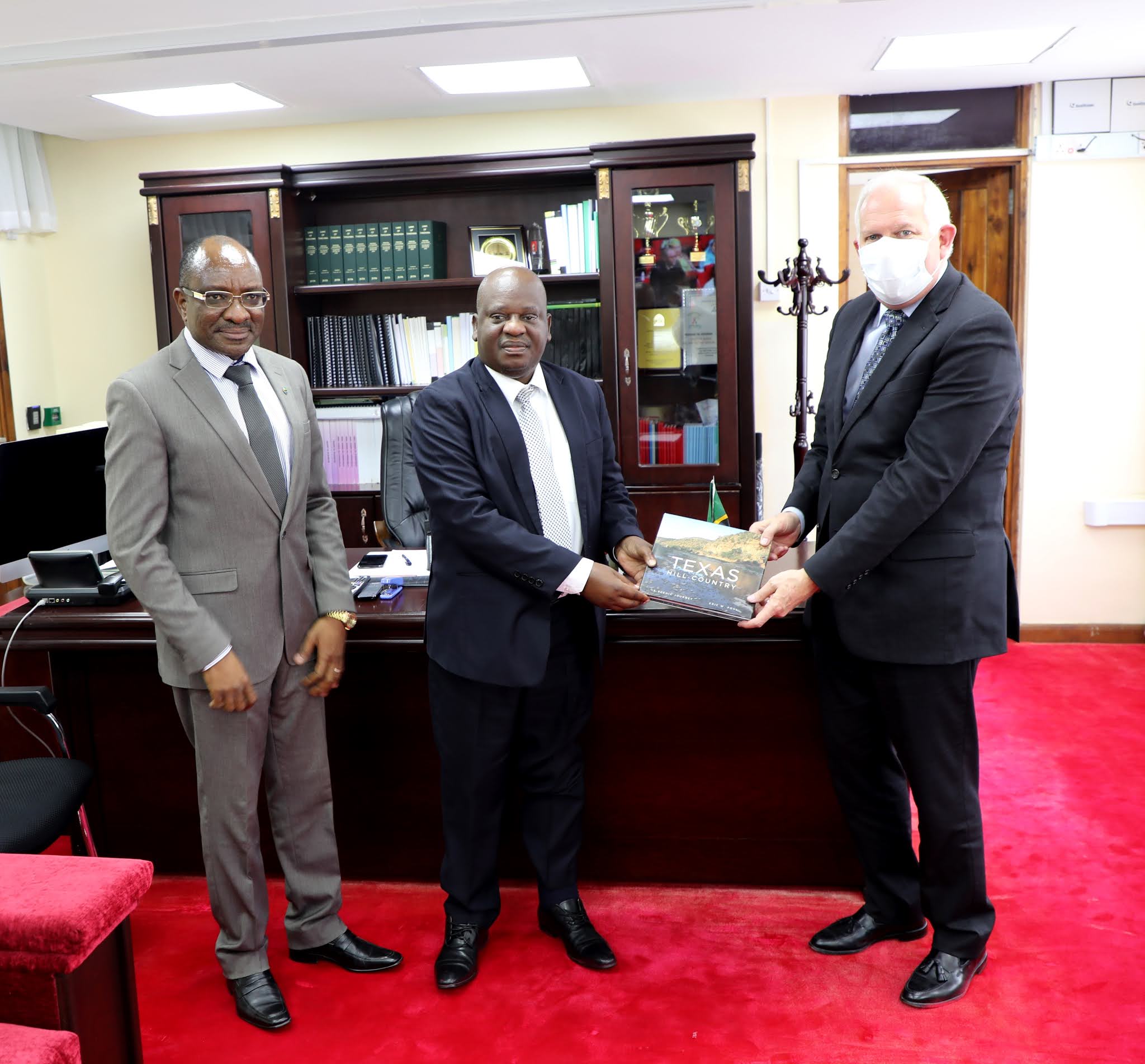Spika wa Bunge, Mhe. Job Ndugai (katikati) akipokea zawadi ya kitabu kutoka kwa Balozi wa Marekani nchini Tanzania, Mhe. Dkt. Donald Wright (kulia) alipomtembelea leo ofisini kwake Bungeni Jijini Dodoma, Kushoto ni Katibu wa Bunge, Ndg. Stephen Kagaigai. Dhumuni la miadi hiyo ni kumsalimu na kujadili masuala Mbalimbali ya ushirikiano wa kisekta kati yao na Bunge la Jamhuri ya Muungano wa Tanzania.