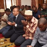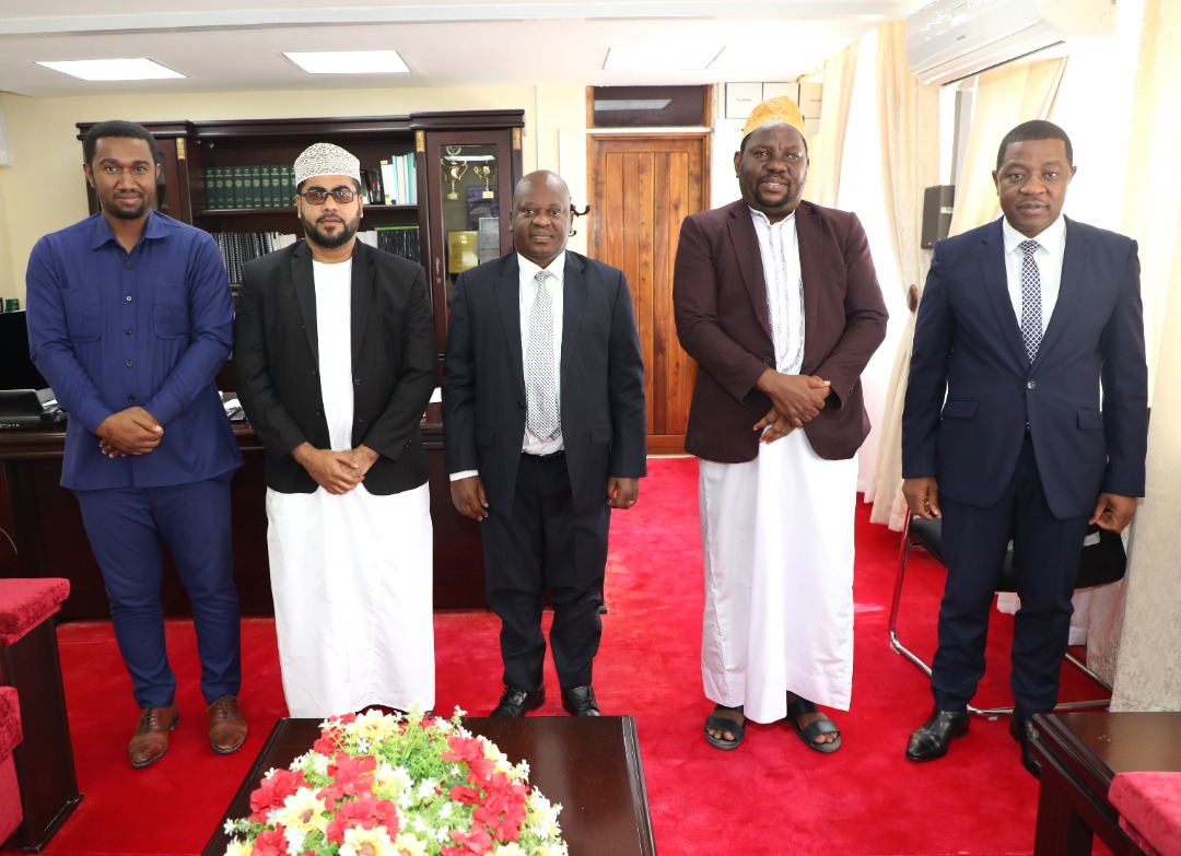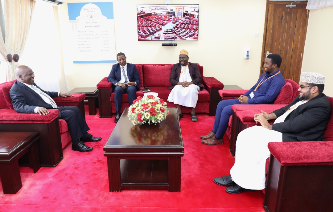 Spika wa Bunge, Mhe. Job Ndugai (Kushoto) akifurahia Jambo na viongozi wa Jumuiya ya kuhifadhisha Qur’an Tanzania wakiongozwa na Mwenyekiti wao Sheikh Othman Ali Kaporo (katikati) walipomtembelea leo Ofisini kwake Bungeni Jijini Dodoma. Kushoto kwake ni Naibu Waziri wa Mifugo na Uvuvi, Mhe. Abdallah Ulega.