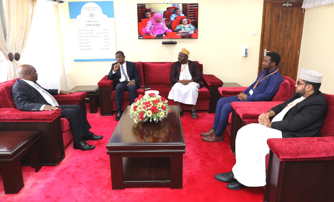 Spika wa Bunge, Mhe. Job Ndugai (Kushoto) akimsikiliza Naibu Waziri wa Mifugo na Uvuvi, Mhe. Abdallah Ulega (wapili kushoto) pale viongozi wa Jumuiya ya kuhifadhisha Qur’an Tanzania wakiongozwa na Mwenyekiti wao Sheikh Othman Ali Kaporo (katikati) walipomtembelea leo Ofisini kwake Bungeni Jijini Dodoma.