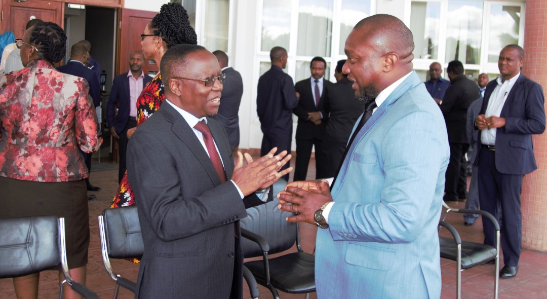 Waziri wa Nchi, Ofisi ya Rais, Menejimenti ya Utumishi wa Umma na Utawala Bora, Mhe. Mohamed Mchengerwa akizungumza jambo na Katibu Mkuu wa Ofisi yake, Dkt. Laurean Ndumbaro mara baada ya Waziri huyo kufungua Mkutano wa Baraza Kuu la Nne la Wafanyakazi katika Utumishi wa Umma jijini Dodoma.