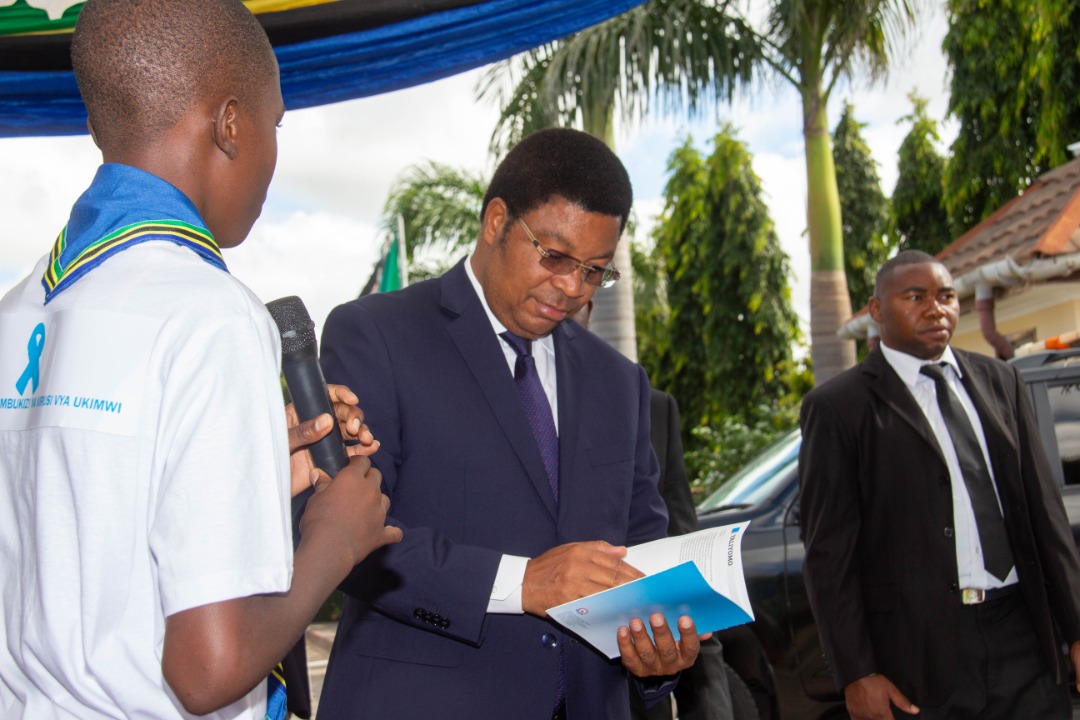Waziri Mkuu wa Jamhuri ya Muungano wa Tanzania Mhe Kassim Majaliwa akipokea maelezo kutoka kwa Kiongozi wa Wawakilishi wa kundi la Vijana Balehe Najma Mohamed wakati wa uzinduzi wa Ajenda ya Kitaifa ya kuwekeza katika Afya na Maendeleo ya Vijana Balehe iliyofanyika leo April 17,2021 jijini Dodoma.