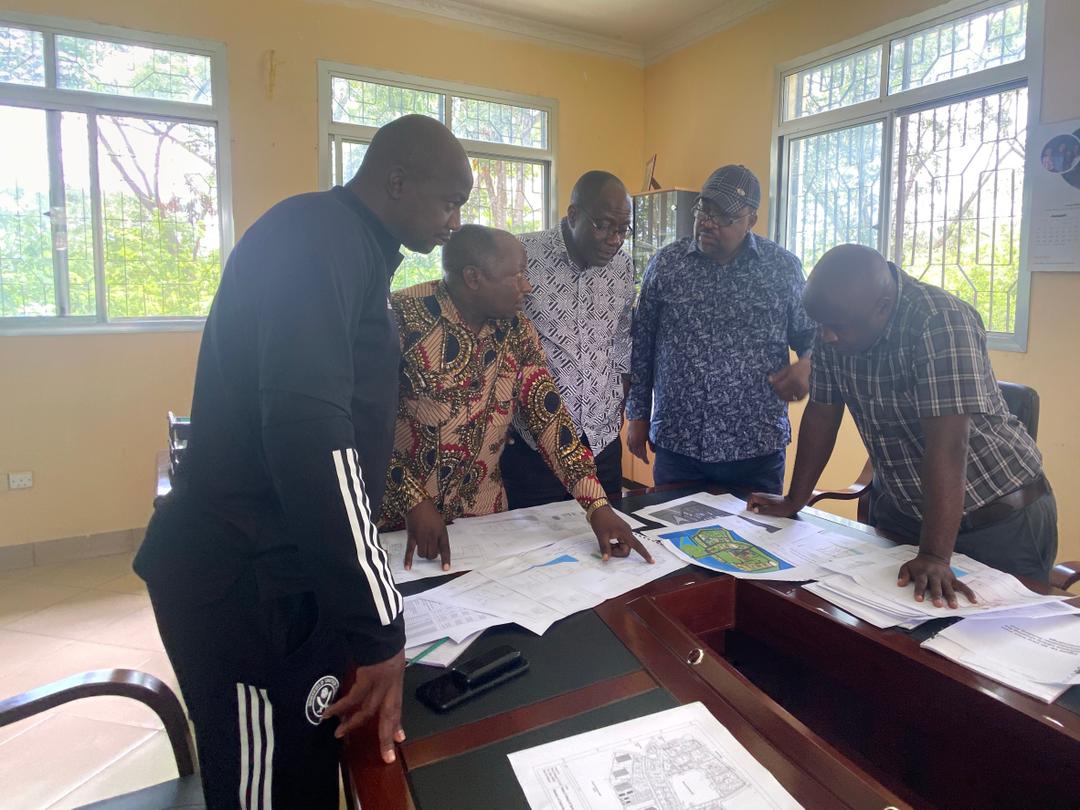 Timu ya wataalam mbalimbali wa michezo na ardhi ikipitia ramani ya maeneo ya ujenzi wa madarasa na hosteli. |