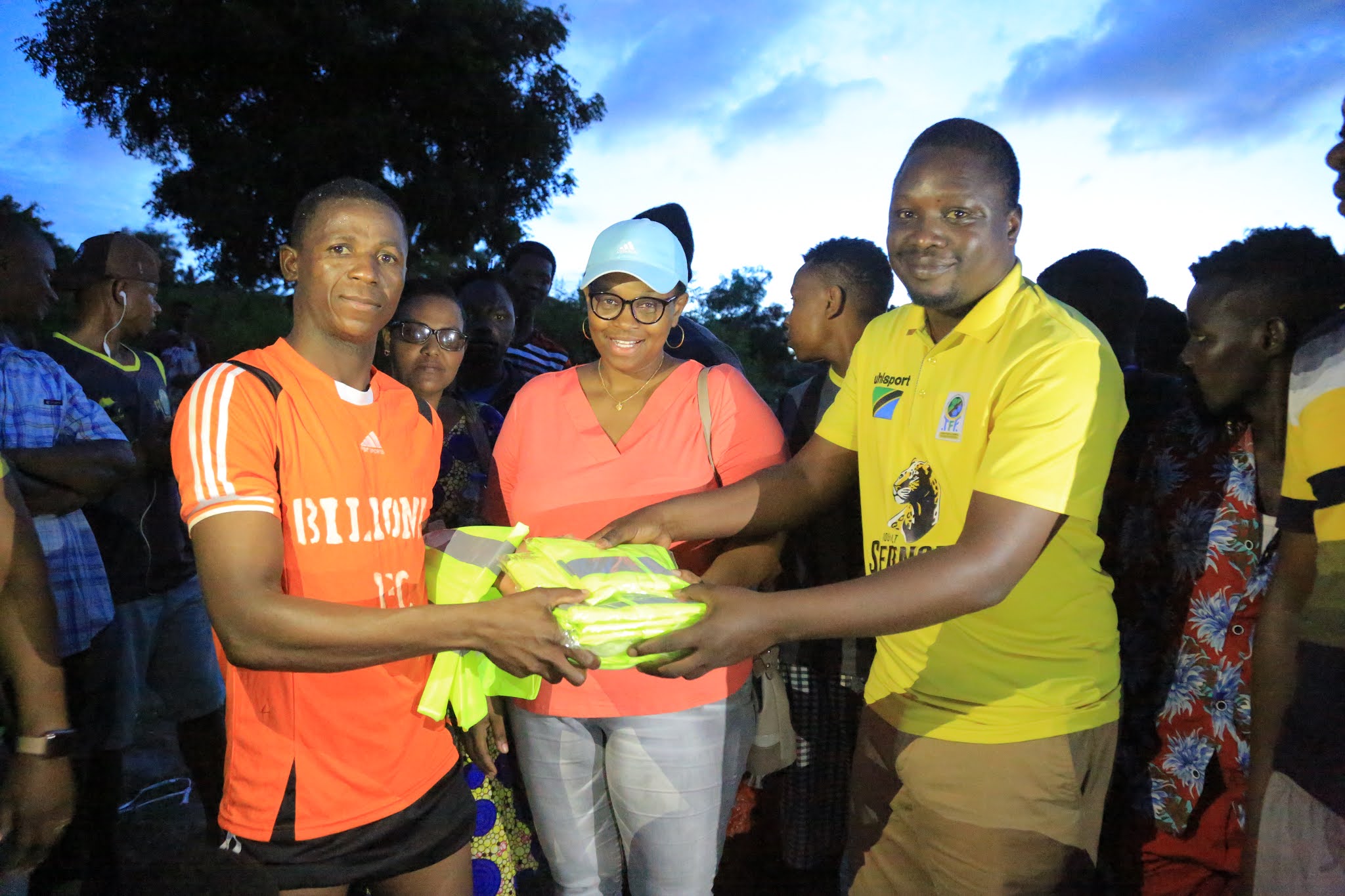 Mwakilishi kutoka Shirikisho la Mpira wa Miguu Tanzania(TFF) Aaron Nyanda akikabidhi zawadi ya Vizibao vyenye kuakisi mwanga (Reflekta) kwa Kiongozi wa Timu ya Kontena FC, baada kuibuka washindi wa pili katika mashindano ya Kombe la Kichangani Bodaboda Football kupinga ukatili wa kijinsia,mashindao hayo yamefanyika mwishoni mwa wiki katika uwanja wa Kunguru-Goba mkoani Dar es Salaam.Pichani wa pili kulia ni Mkurugenzi Mtendaji wa Taasisi ya Gender Action Tanzania (GATA), Neema Makando.