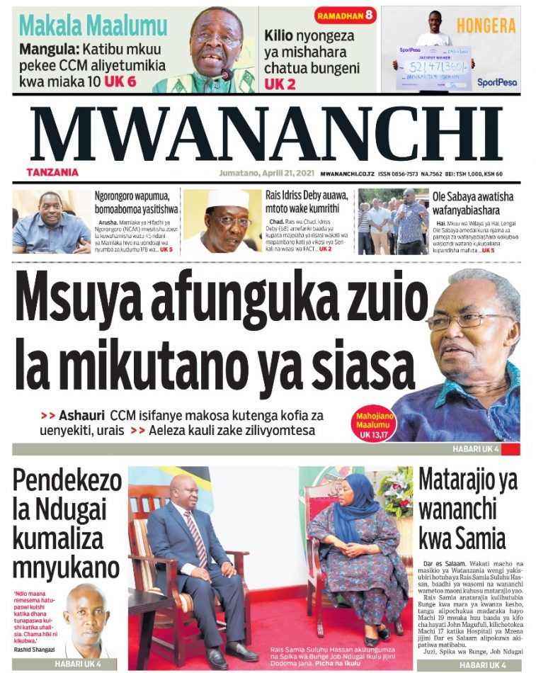 MagazetiPITIA VICHWA VYA HABARI KATIKA MAGAZETI YA LEO APRIL 21,2021 Last updated: 2021/04/21 at 2:31 AM Alex Sonna 5 years ago Share SHARE Alex Sonna April 21, 2021 April 21, 2021 Share this Article Facebook Twitter Email Print Previous Article KATIBU MKUU WIZARA YA AFYA PROFESA ABEL MAKUBI ASHAURI BARAKOA ZINUNULIWE MSD Next Article MPANGO WA KUNUSURU KAYA MASKINI (TASAF) KUANZA NYASA