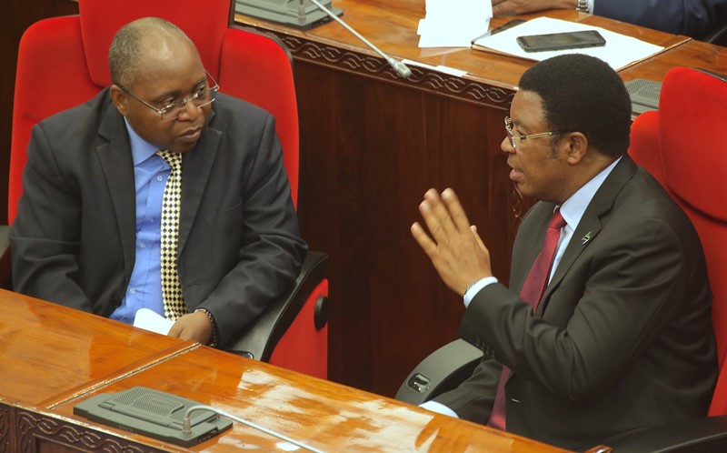 Waziri Mkuu, Kassim Majaliwa akizungumza na Waziri wa Maliasili na Utalii, Dkt. Damas Ndumbaro, Bungeni jijini Dodoma, Aprili 21, 2021. (Picha na Ofisi ya Waziri Mkuu).