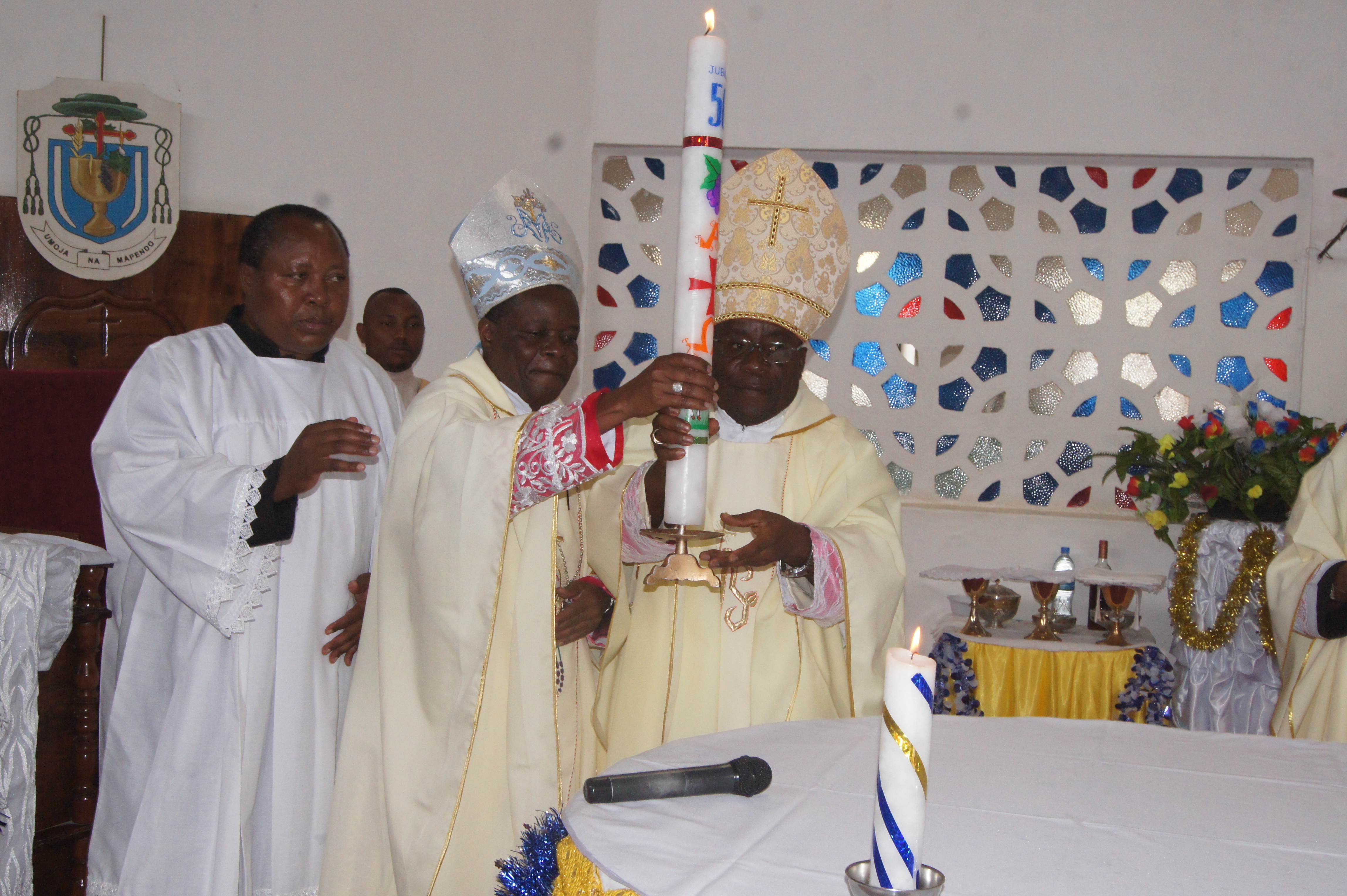 Maaskofu Bernadin Mfumbusa (kushoto) na Edward Mapunda (kulia) wakiwa wameshika Mshumaa wa Jubilei ya dhahabu ya miaka 50 tangu kuanzishwa kwa Jimbo Katoliki Singida.
