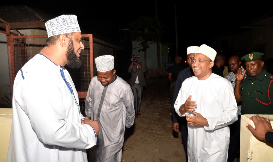 RAIS wa Zanzibar na Mwenyekiti wa Baraza la Mapinduzi Alhaj Dk. Hussein Ali Mwinyi akisalimiana na Kiongozi wa Masjid Sunna Rahaleo Jijini Zanzibar (Msikiti wa Bachu Rahaleo) Sheikh Ahmed Haidar Jabir, alipowasili katika viwanja vya Masjid hiyo kuhudhuria Ibada ya Sala ya Isha na Tarawekh, iliofanyika jana usiku 21-4-2021.(Picha na Ikulu)