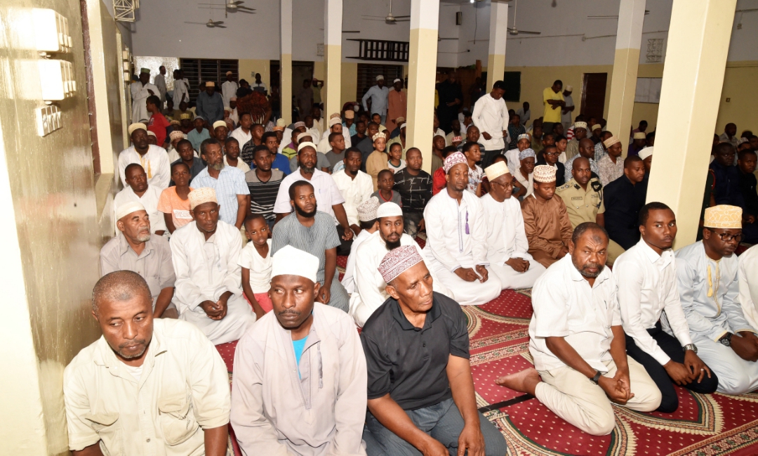 RAIS wa Zanzibar na Mwenyekiti wa Baraza la Mapinduzi Alhaj Dk.Hussein Ali Mwinyi akijumuika na Waumini wa Dini ya Kiislam katika Ibada ya Sala ya Tarawekh iliofanyika katika Masjid Sunna Rahaleo Jijini Zanzibar (Msikiti wa Bachu Rahaleo) na (kushoto kwa Rais) Katibu wa Mufti Mkuu wa Zanzibar Sheikh Khalid Ali Mfaume na (kulia kwa Rais) Kiongozi wa Masjid hiyo Sheikh Ahmed Haidar Jabir.(Picha na Ikulu).