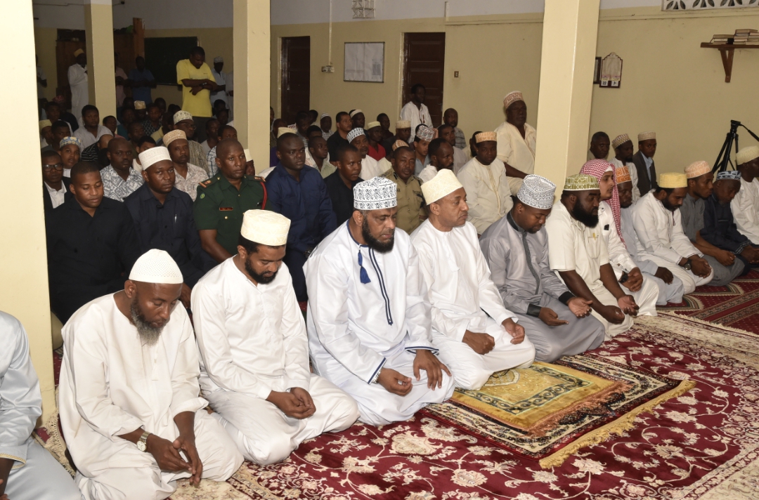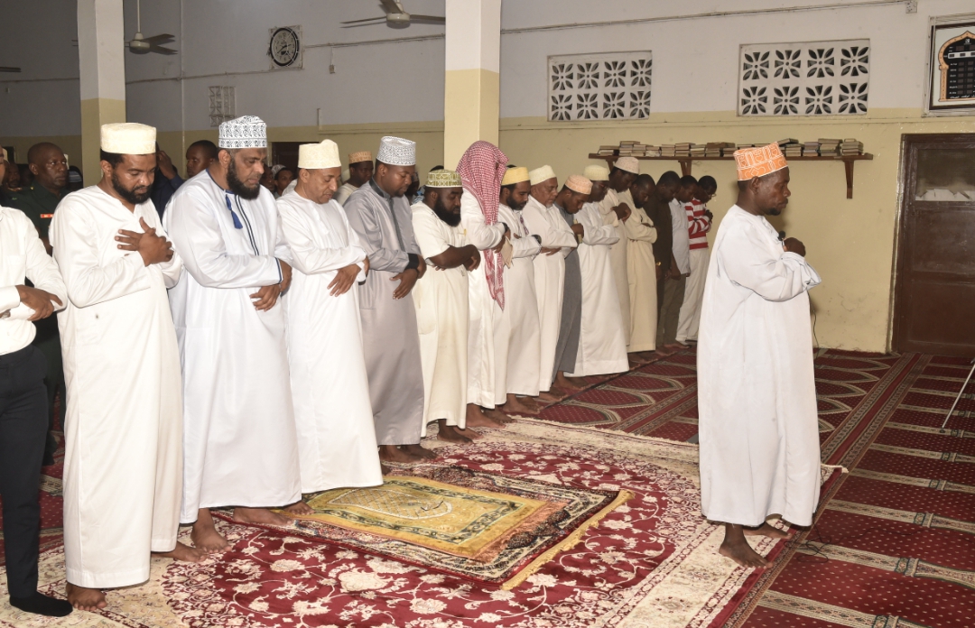 RAIS wa Zanzibar na Mwenyekiti wa Baraza la Mapinduzi Alhaj Dk. Hussein Ali Mwinyi akivuta uradi baada ya kumaliza kwa Sala ya Isha iliofanyika katika Masjid Sunna Rahaleo Jijini Zanzibar, (Msikiti wa Bachu Rahaleo) na (kushoto kwa Rais) Katibu wa Mufti Mkuu wa Zanzibar Sheikh Khalid Ali Mfaume na (kulia kwa Rais) Kiongozi wa Masjid Sunna Rahaleo Sheikh Ahmed Haidar Jabir.(Picha na Ikulu).