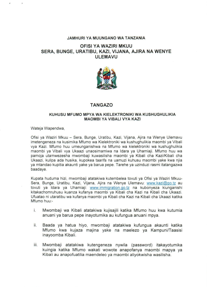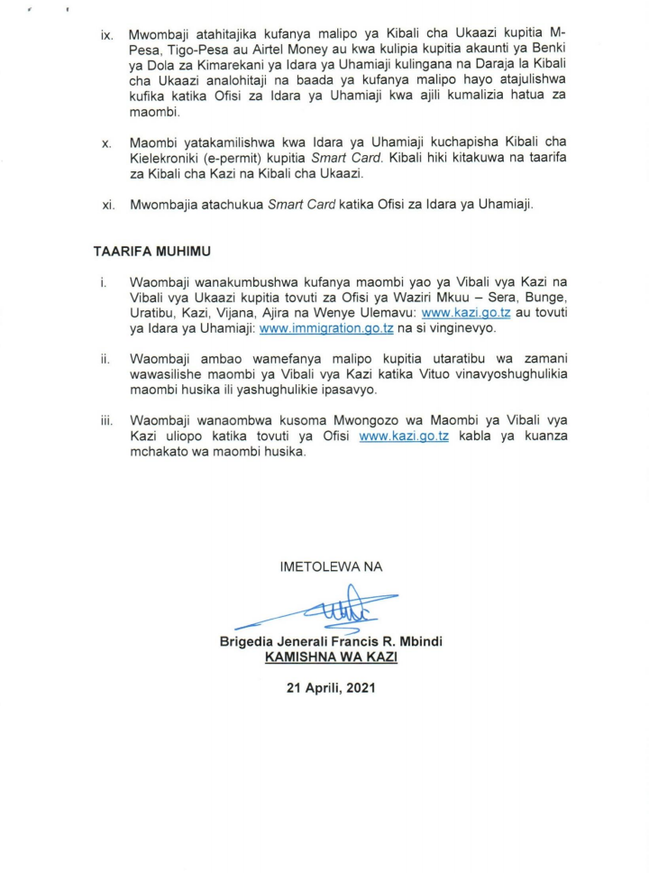 MchanganyikoTAARIFA KUHUSU MFUMO WA KIELEKTRONIKI WA KUSHUGHULIKIA MAOMBI YA VIBALI VYA KAZI Last updated: 2021/04/23 at 10:54 AM joseph 5 years ago Share SHARE joseph April 23, 2021 April 23, 2021 Share this Article Facebook Twitter Email Print Previous Article RAS Mmbaga: Tuboreshe huduma za Afya ya Mama na Mtoto Next Article SIMBACHAWENE AKUTANA NA KUFANYA MAZUNGUMZO NA BALOZI WA MAREKANI NCHINI TANZANIA