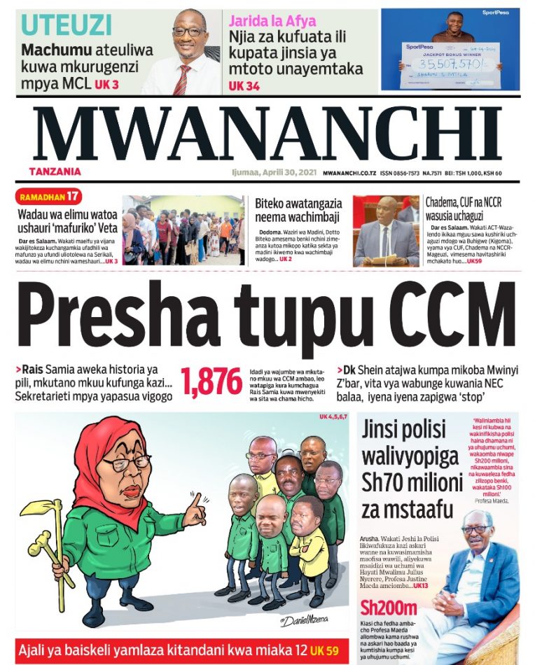 MagazetiPITIA VICHWA VYA HABARI KATIKA MAGAZETI YA LEO APRIL 30,2021 Last updated: 2021/04/30 at 3:14 AM Alex Sonna 5 years ago Share SHARE Alex Sonna April 30, 2021 April 30, 2021 Share this Article Facebook Twitter Email Print Previous Article ONGEZENI KASI YA UTEKELEZAJI WA HATUA ZA KUKIKINGA NA MAGONJWA YA KUAMBUKIZA Next Article PROF. KOMBA ATAKA TSC IONE FAHARI KUHUDUMIA WALIMU WENYE MAADILI