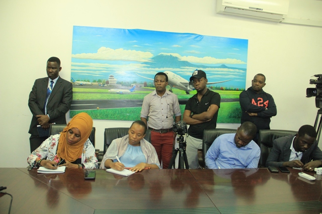 Baadhi ya waandishi wa habari wakimsikiliza Mkurugenzi Mtendaji wa kampuni ya ndege Tanzania(ATCL) Injinia Ladslaus Matindi wakati akizungumza nao leo jijini Dar es salaam.