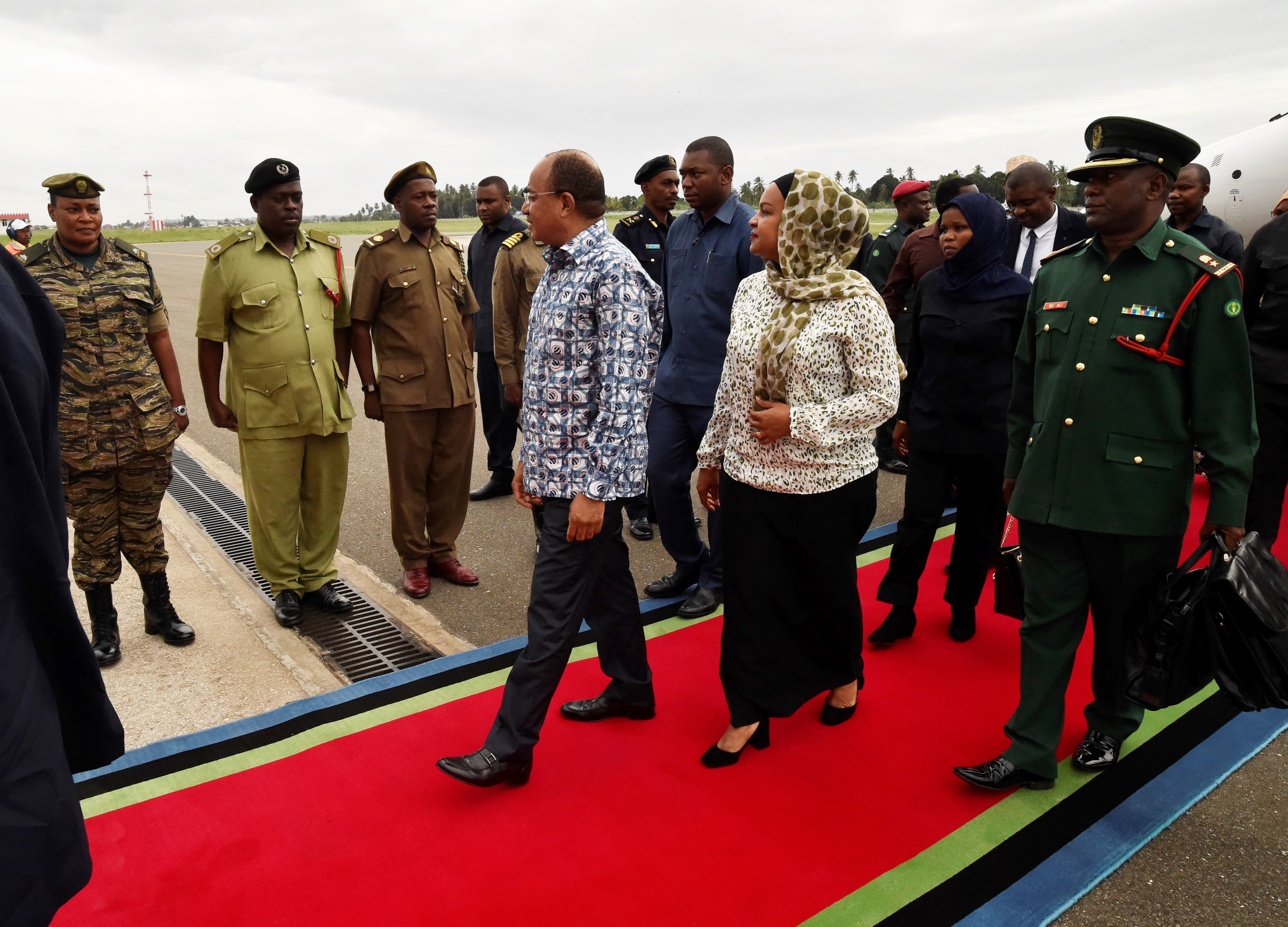 Rais wa Zanzibar na Mwenyekiti wa Baraza la Mapinduzi Mhe.Dk.Hussein Ali Mwinyi akiwa na Mkewe Mama Mariam Mwinyi, akisalimiana na Wakuu wa Vikosi vya Ulinzi na Usalama Zanzibar, baada ya kuwasili Uwanja wa Ndege wa Kimataifa wa Abeid Amani Karume Jijini Zanzibar, akitokea Kisiwani Pemba baada ya kumaliza ziara yake ya Siku mbili.(Picha na Ikulu)