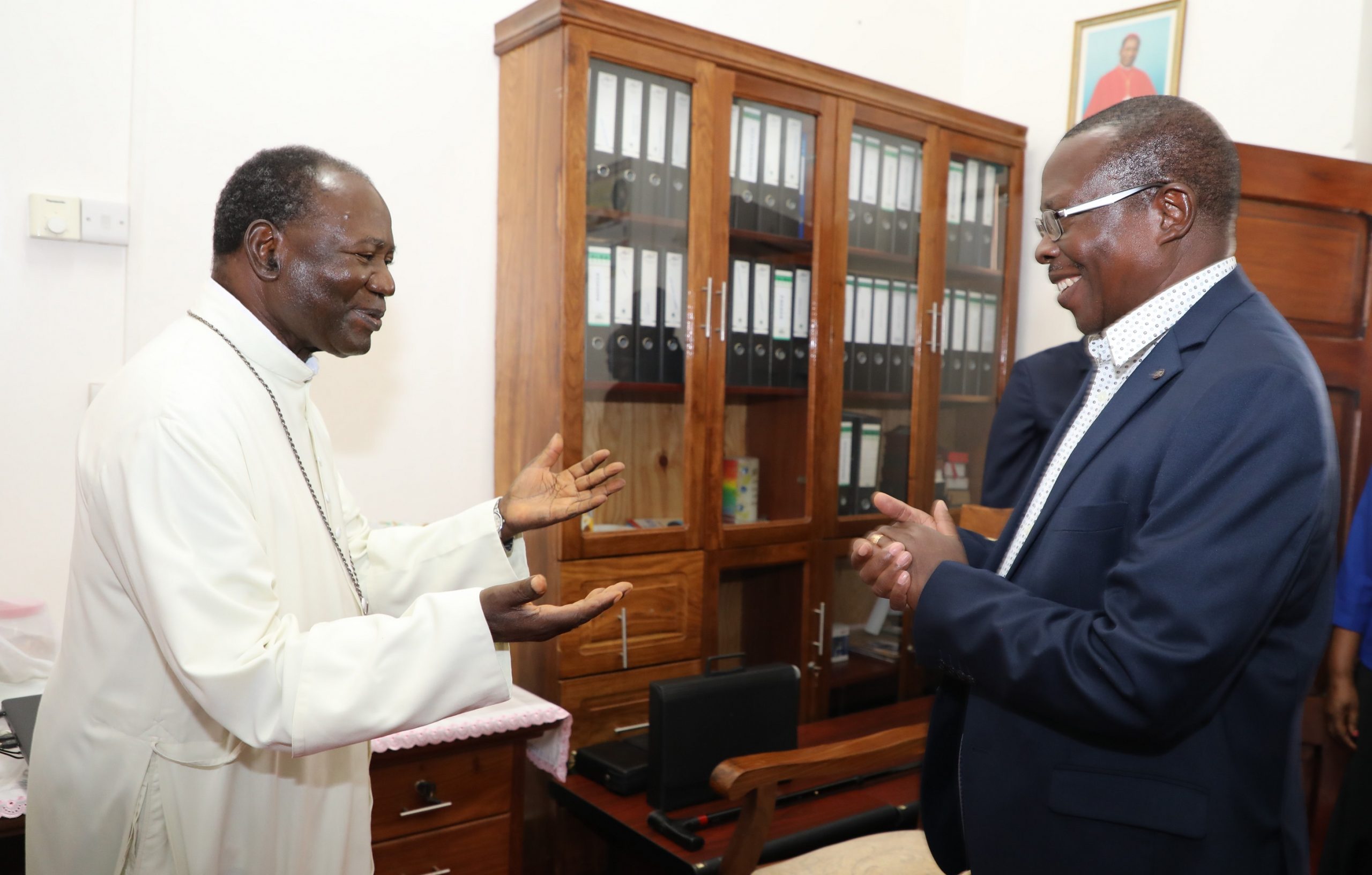 Makamu wa Rais wa Jamhuri ya Muungano wa Tanzania Mhe. Dkt. Philip Isdor Mpango, akisalimiana na kuzungumza na Askofu Mkuu Msataafu wa Jimbo Kuu la Dar es salaam Kardinal Poycard Pengo wakati alipomtembelea Ofisini kwake katika Kanisa la S.T Georseph Jijini Dar es Salaam leo Mei 07,2021.