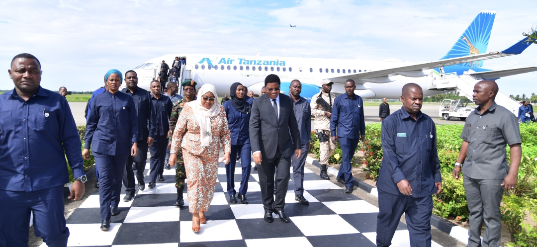 Rais wa Jamhuri ya Muungano wa Tanzania, Mhe. Samia Suluhu Hassan akizungumza jambo na Waziri Mkuu Kassim Majaliwa mara baada ya kuwasili katika uwanja wa Ndege wa Kimataifa wa Julius Nyerere Jijini Dar es Salaam leo tarehe 07 Mei, 2021.