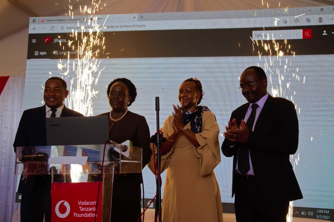 Waziri wa Elimu,Sayansi na Tekonolojia Prof. Joyce Ndalichako,akiwa na Mkurugenzi wa Vodacom Foundation,Rosalynn Mworia ,kushoto kwake ni Naibu Waziri wake Mhe.Omary Kipanga na kulia ni Katibu Mkuu wake Dk.Leonard Akwilapo, wakizindua tovuti ya elimu iitwayo E- fahamu yenye lengo la kuwasaidia walimu na wanafunzi kupata vitabu vya ziada na kiada kwa shue za msingi na sekondari vinavyofuata mitaala ya kutoka maktaba ya Taasisi ya Elimu Tanzania na masomo ya kimataifa bure kwa njia ya mtandao leo Mei 7,2021 jijini Dodoma.