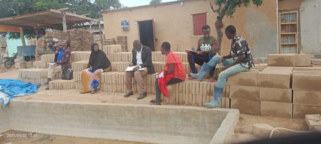 Kaimu Afisa Vijana Mkoa wa Singida, Frederick Ndahan (wa pili walio kaa kutoka kushoto) akiwa na Vijana wa Puma Youth Group.baada ya kutembelea mradi wa ufyatuaji matofa wilayani humo jana.