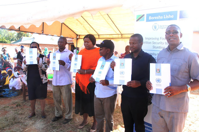 Viongozi mbalimbali wa Halmashauri ya Wilaya ya Singida, wakiwa na kabrasha lenye maelezo ya Mradi wa Boresha Lishe baada ya kukabidhiwa rasmi mradi huo katika Kijiji cha Sekeutoure Wilayani Singida jana. Kutoka kulia ni Mwenyekiti wa Halmashauri hiyo, Eliya Digha, Katibu Tawala wa Wilaya hiyo, Hassan Ngoma, Mkurugenzi wa Halmashauri ya Wilaya ya Singida, Rashid Mandoa, Mwakilishi wa Ofisi ya Rais (TAMISEMI) Idara ya Afya Kitengo cha Lishe, Mariam Nakuwa, Mwenyekiti wa kijiji hicho Joshua Majengo na Afisa Lishe wa Wilaya hiyo, Neema Swai.