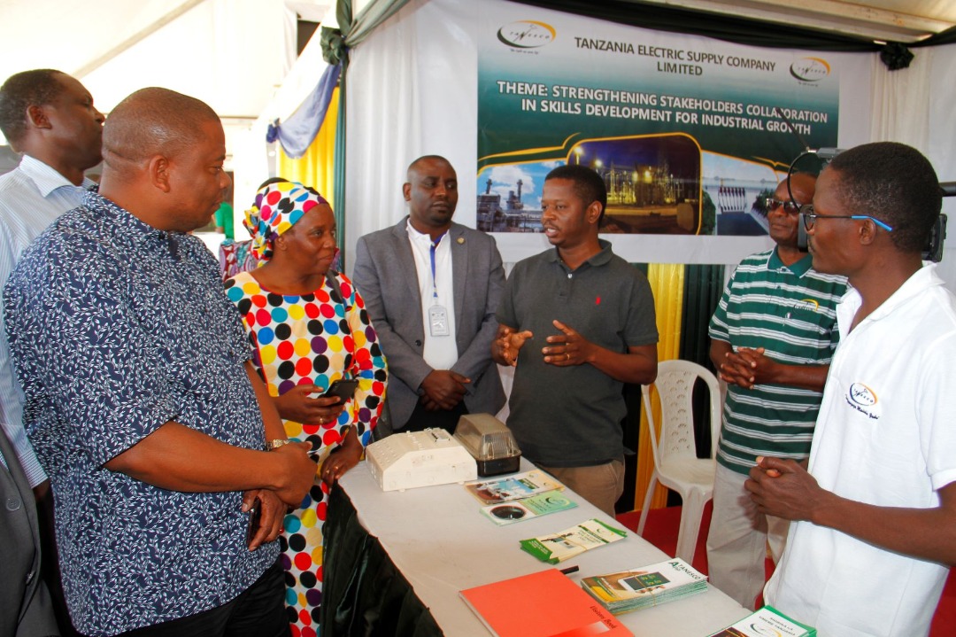 Mkuu wa Mkoa wa Dodoma Anthony Mtaka,akipata maelezo kutoka kwa Mhandisi wa Miradi TANESCO,Erasto Chiswanu alipotembelea banda la TANESCO katika maonyesho ya pili ya elimu ya mafunzo na ufundi yaliyoandaliwa na NACTE kwa kushirikiana na Taasisi ya sekta binafsi (TPSF) yanayoendelea katika uwanja wa Jamhuri jijini Dodoma
