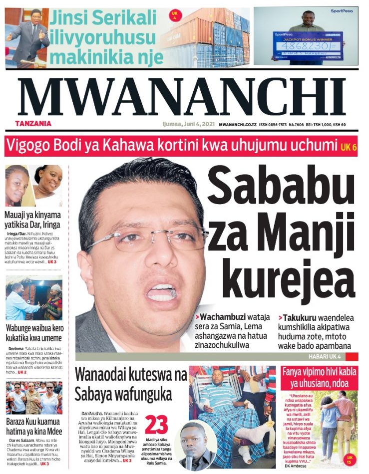 MagazetiPITIA VICHWA VYA HABARI KATIKA MAGAZETI YA LEO JUNE 4,2021 Last updated: 2021/06/04 at 2:35 AM Alex Sonna 4 years ago Share SHARE Alex Sonna June 4, 2021 June 4, 2021 Share this Article Facebook Twitter Email Print Previous Article MEYA SHINYANGA AWEKA JIWE LA MSINGI UJENZI WA MTAMBO WA KUCHAKATA TOPE KINYESI Next Article NSSF YASHIRIKI MAONYESHO YA WIKI YA MAZIWA KUTEKELEZA AGIZO LA KUWAFIKIA SEKTA ISIYORASMI NA WAFANYABIASHARA WADOGO WADOGO