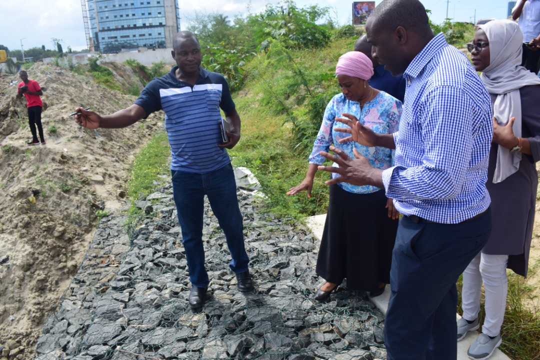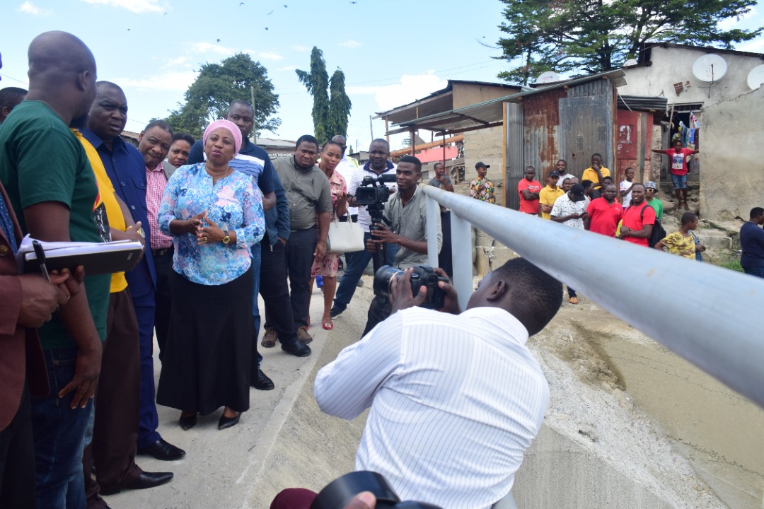 Waziri wa Nchi Ofisi ya Rais Tawala za Mikoa na Serikali za Mitaa (TAMISEMI) Mhe. Ummy Mwalimu akikagua miundombinu katika mto Tandale kwenye ziara yake ya kukagua Utekelezaji wa Mradi wa Uendelezaji wa Jiji la Dar es Salaam (DMDP) katika Manispaa ya Kinondoni ambapo amekagua mradi wa Bwawani, barabara ya Tandale-Kisiwani, Mto sinza, Barabara ya Makanya na barabara ya Shekilango.