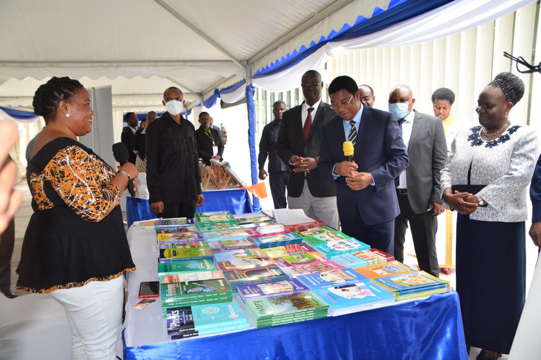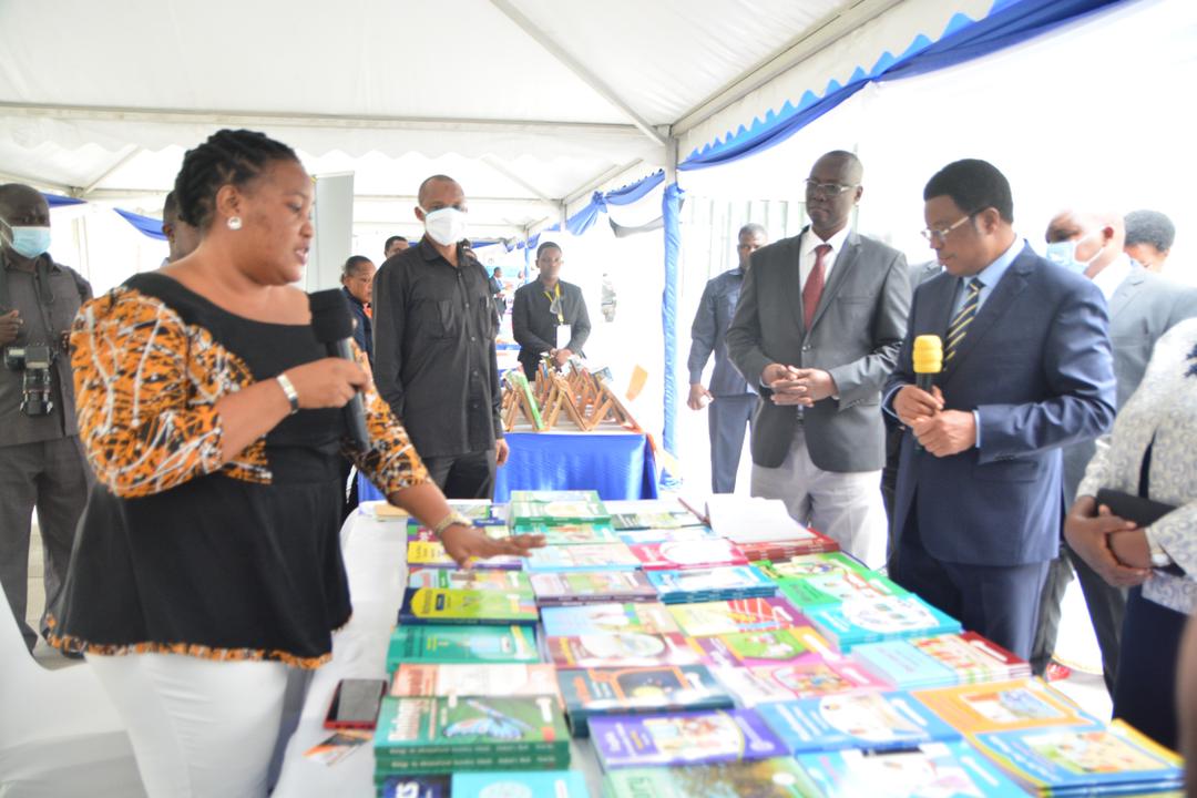 Waziri Mkuu wa Jamhuri ya Muungano wa Tanzania,Mhe. Kassim Majaliwa akipata maelezo kutoka kwa Afisa Uhusiano wa Taasisi ya Elimu Tanzania (TET) Bi. Dorothy Natale,kuhusu upatikanaji wa vitabu vya kiada Shuleni katika kongamano la miaka 50 la Elimu ya watu wazima linalofanyika katika viwanja vya maktaba kuu ya Chuo Kikuu cha Dar es salaam kuanzia tarehe 9 hadi 11 mwezi Juni.