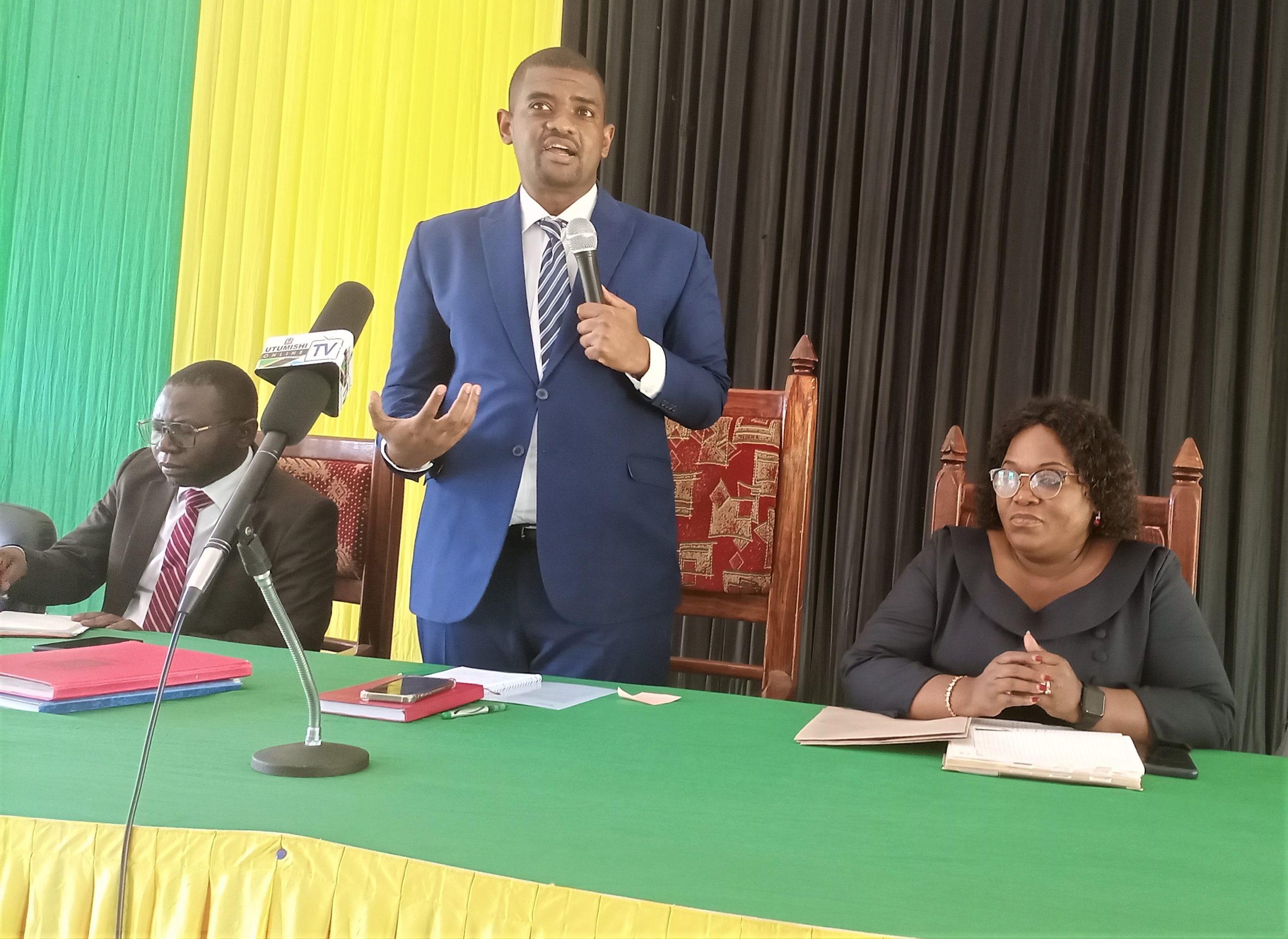 Mkurugenzi wa Halmshauri ya Mji Kondoa Bw. Msoleni Dakawa akiwasilisha taarifa ya utekelezaji ya halmashauri yake kwa Naibu Waziri, Ofisi ya Rais, Menejimenti ya Utumishi wa Umma na Utawala Bora, Mhe. Deogratius Ndejembi wakati wa kikao kazi cha Naibu Waziri huyo na Watumishi wa Wilaya hiyo leo chenye lengo la kuhimiza uwajibikaji kwa Watumishi wa Umma wilayani humo.