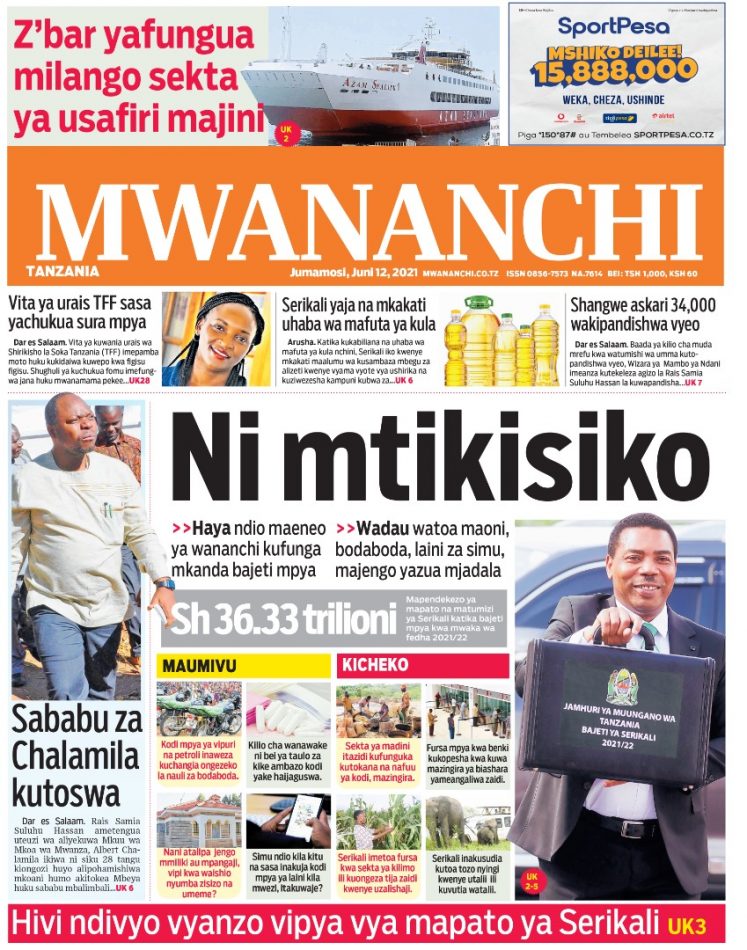 MagazetiPITIA VICHWA VYA HABARI KATIKA MAGAZETI YA LEO JUNE 12,2021 Last updated: 2021/06/12 at 2:40 AM Alex Sonna 4 years ago Share SHARE Alex Sonna June 12, 2021 June 12, 2021 Share this Article Facebook Twitter Email Print Previous Article RC MTAKA ATETA NA BALOZI WA NAMIBIA NCHINI TANZANIA MHE. LEBIUS TANGENI TOBIUS Next Article NDAHANI AWATAKA VIJANA WASICHANA KUWA CHACHU YA MAENDELEO KATIKA MAENEO YAO