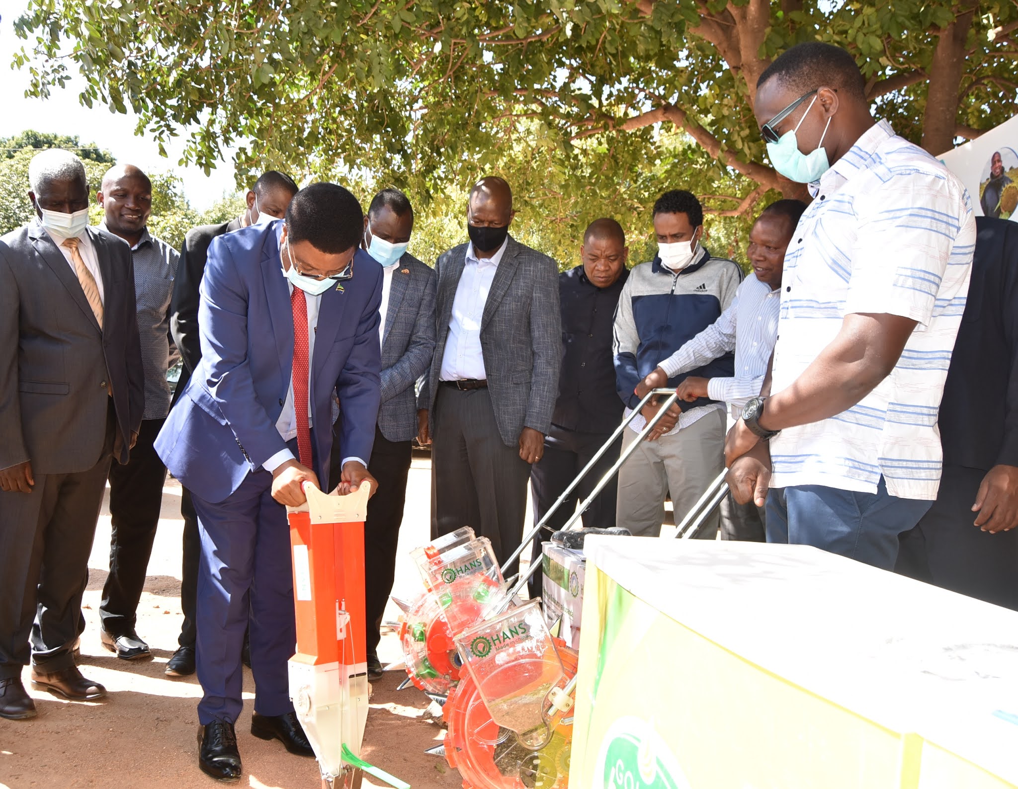 Waziri Mkuu Kassim Majaliwa akijaribu mashine maalumu ya kuoteshea alizeti, wakati alipokuwa akitembelea mabanda katika mkutano na wadau wa zao la alizeti, uliofanyika mkoani hapa leo. Kulia ni Meneja wa Wakulima Wadogo kutoka Kampuni ya Pyxus, Edwin Shio