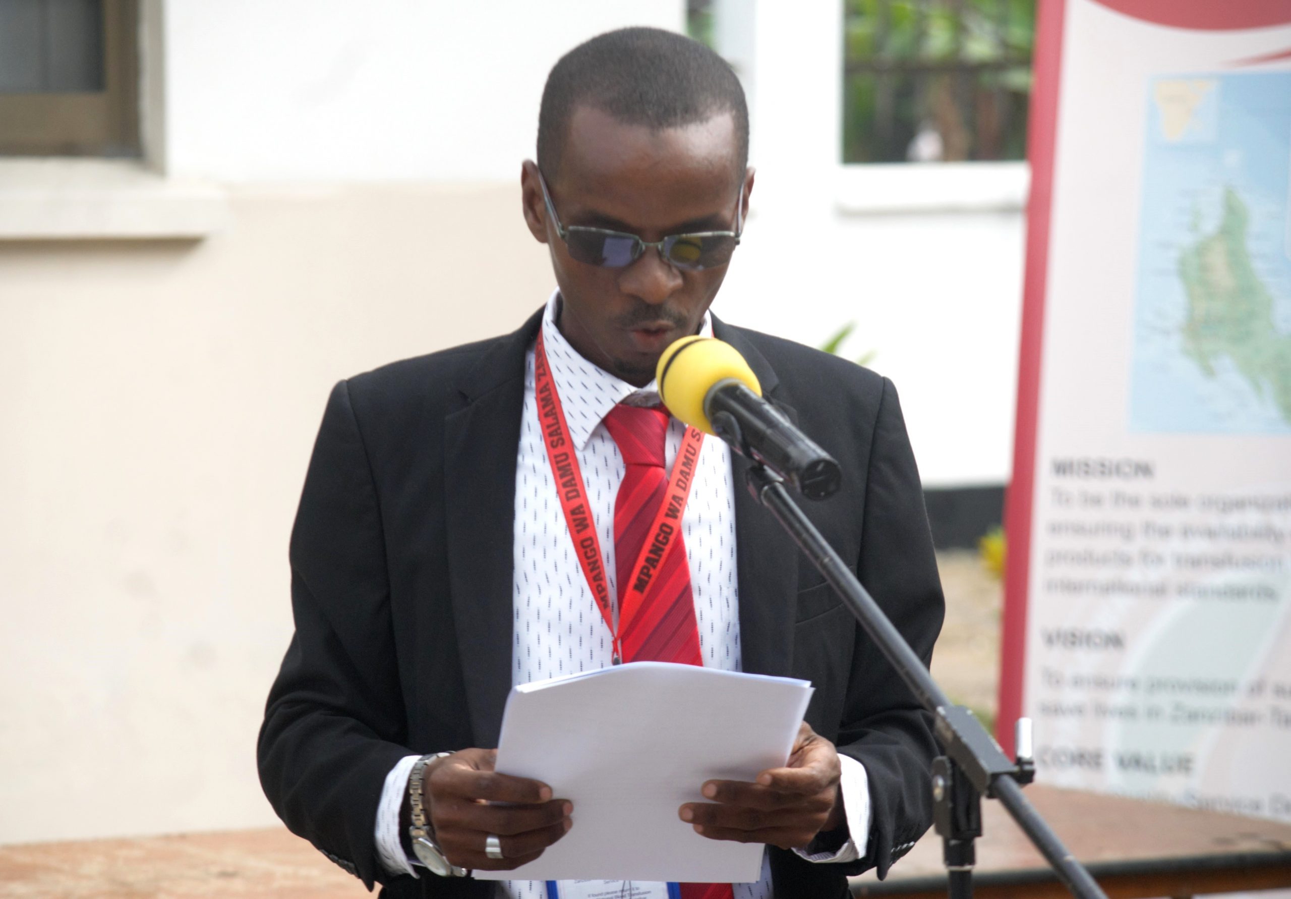 Afisa uhusiano, habari, masoko Damu salama Ussi Bakari Mohd akisoma risala ya wachangia damu katika sherehe ya maadhimisho ya siku ya wachangia damu Duniani iliyofanyika Makao Makuu ya Benki ya damu Sebleni kwa wazee Mjini Zanzibar.