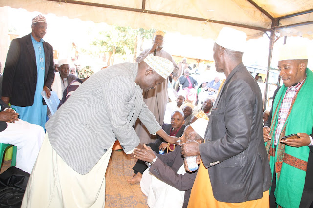 Kaimu Sheikh wa Mkoa wa Singida Issa Nassoro, akisalimiana na Waislamu waliofika kwenye dua hiyo.