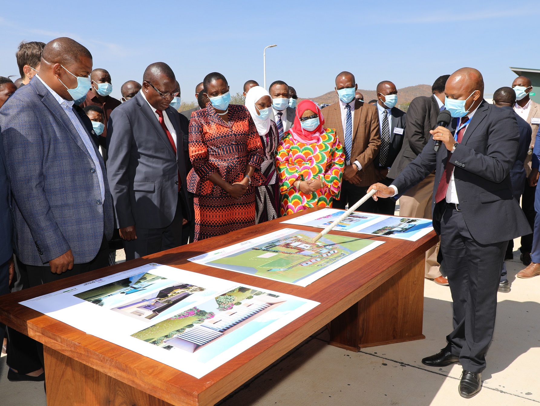 Makamu wa Rais wa Jamhuri ya Muungano wa Tanzania Mheshimiwa Dkt. Philip Mpango, akiangalia Ramani na kupata maelezo kutoka kwa Msanifu wa Majengo David Kibebe kuhusu ujenzi wa Nyumba za Makazi na Huduma mbalimbali, Wakati wa Uzinduzi wa Makao ya Taifa ya Watoto wanaoishi katika Mazingira Hatarishi iliyoambatana na Maadhimisho ya Siku ya Mtoto wa Afrika, iliyoadhimishwa leo Juni 16,2021 katika Kijiji cha Kikombo Jijini Dodoma. wa pili kulia Dkt. Doroth Gwajima (MB) Waziri wa Afya, Maendeleo ya Jamii, Jinsia, Wazee na watoto. kushoto ni Mkuu wa Mkoa Dodoma Mhe. Anthony Mtaka