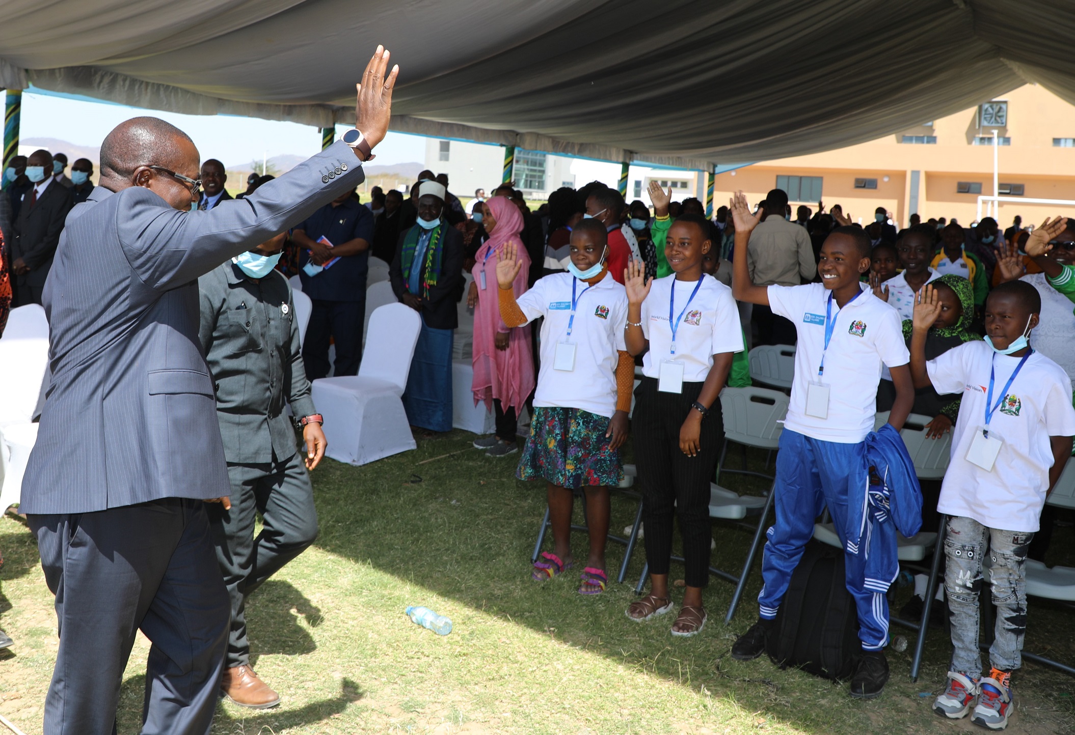 Makamu wa Rais wa Jamhuri ya Muungano wa Tanzania Mheshimiwa Dkt. Philip Mpango, akiagana na Watoto wanaotunzwa katika Makao ya Taifa ya Watoto wanaoishi katika Mazingira Hatarishi kwenye Maadhimisho ya Siku ya Mtoto wa Afrika na Uzinduzi wa Makao ya Taifa ya Watoto leo Juni 16,2021 yaliyofanyika katika Kijiji cha Kikombo Jijini Dodoma.