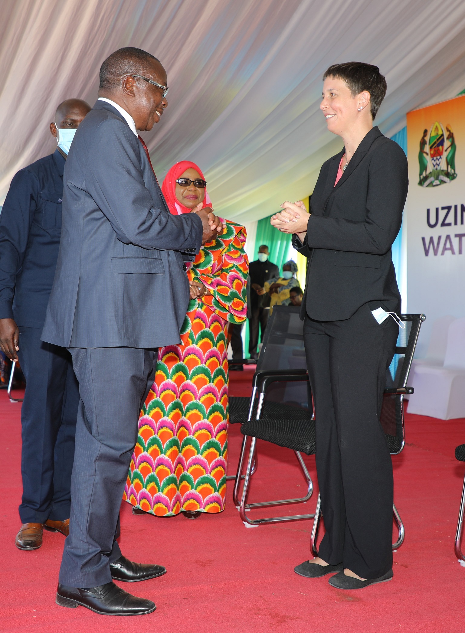 Makamu wa Rais wa Jamhuri ya Muungano wa Tanzania Mheshimiwa Dkt. Philip Mpango, akiagana na Bibi Natalia Lebou Mkurugenzi wa Abbot Fund Tanzania Watoto wanaotunzwa katika Makao ya Taifa ya Watoto wanaoishi katika Mazingira Hatarishi kwenye Maadhimisho ya Siku ya Mtoto wa Afrika na Uzinduzi wa Makao ya Taifa ya Watoto leo Juni 16,2021 yaliyofanyika katika Kijiji cha Kikombo Jijini Dodoma.