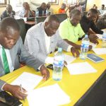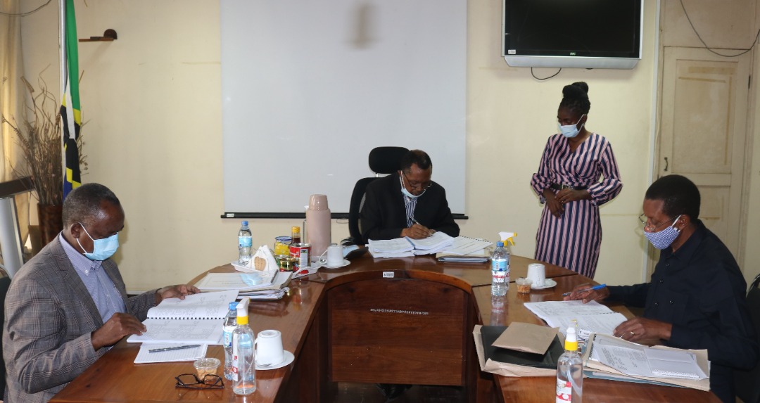 Mwenyekiti wa Tume ya Utumishi wa Umma, jaji (mstaafu) Dkt. Steven J. Bwana (aliyekaa katikati) akisaini nyaraka wakati wa Mkutano wa Tume Na. 4 kwa mwaka wa fedha 2020/2021 ulioanza leo Jijini Dar es Salaam. Wengine ni Mheshimiwa George Yambesi , Kamishna wa Tume (kushoto) na Bw. Nyakimura Muhoji (kulia) Katibu wa Tume ya Utumishi wa Umma. (Picha na PSC)