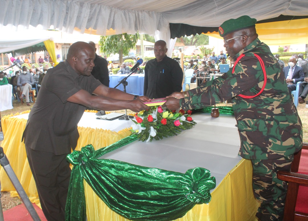 Mkuu wa Wilaya ya Nyasa Kanali Laban Elias Thomas akikabidhiwa na Mkuu wa Mkoa wa Ruvuma ilani ya CCM na Katiba ya Jamhuri ya Muungano wa Tanzania baada ya kuapishwa.