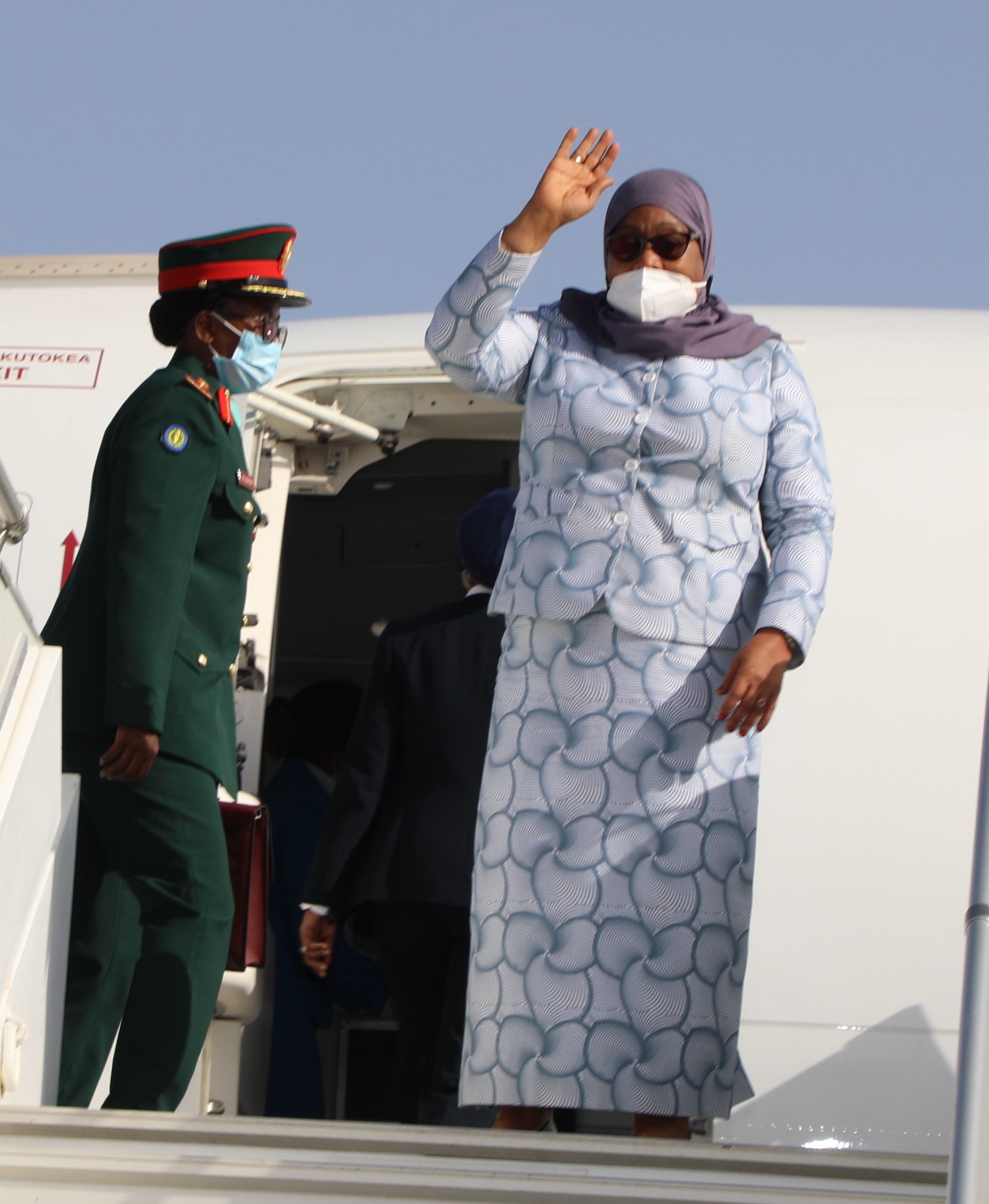 Rais wa Jamhuri ya Muungano wa Tanzania Mhe. Samia Suluhu Hassan, akiagana na Viongozi mbalimbali wa Serikali akiwemo Makamu wa Rais Dkt. Philip Isdor Mpango, katika Uwanja wa Ndege wa Dodoma leo Juni 22,2021, alipokua akielekea Nchini Msumbiji kwa ajili ya kuhudhuria Mkutano wa Dharura wa Wakuu wa Nchi na Serikali wa Jumuiya ya SADC unaotarajiwa kuanza kesho.