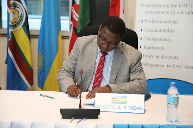 | Mhe. Prof. Mkenda akisaini Ripoti ya Mkutano wa 14 wa Baraza la Kisekta la Mawaziri wa Kilimo na Usalama wa Chakula wa Jumuiya ya Afrika Mashariki uliofanyika jijini Arusha tarehe 25 Juni 2021 |