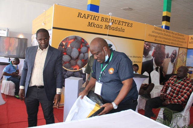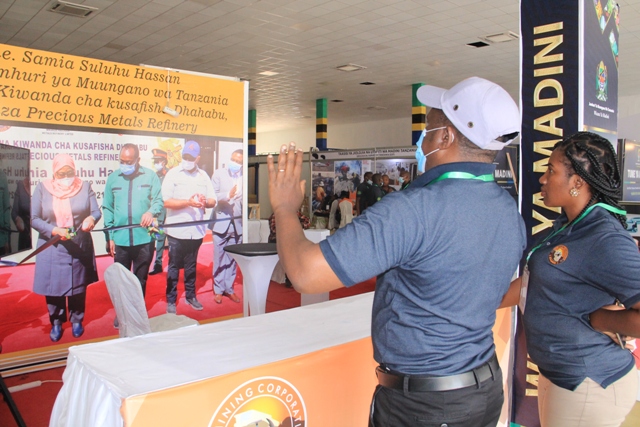 Dr. Venance Mwasse Kaimu Mkurugenzi Mtendaji wa Shirika la Madini Tanzania STAMICO akikagua mabanda mbalimbali yaliyopo katika banda kuu la Wizara ya Madini kushoto ni Afisa Habari wa Shirika hilo Bi. BibiAnna.