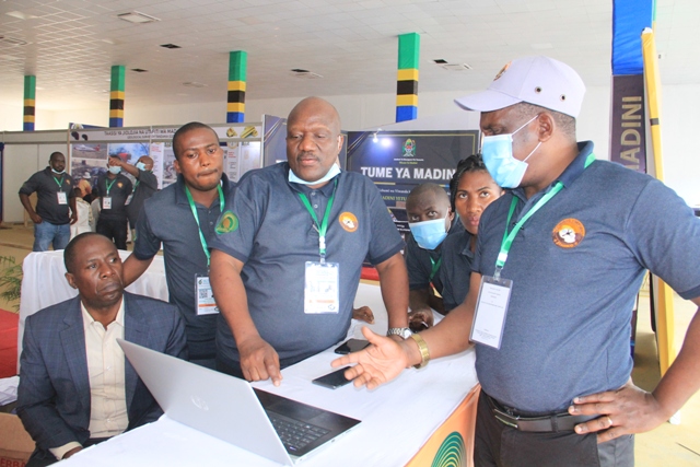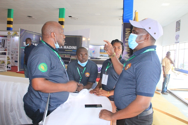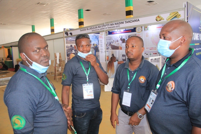 Baadhi ya maofisa wa Shirika la Madini Tanzania STAMICO wakijadiliana jambo katika banda lao viwanja vya sabasaba.