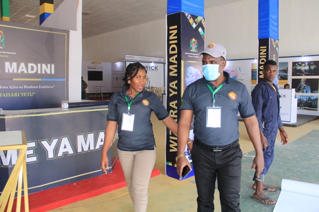 Dr. Venance Mwasse Kaimu Mkurugenzi Mtendaji wa Shirika la Madini Tanzania STAMICO akimuelekeza jambo Afisa habari wa Shirika hilo Bi. BibiAnna ili kukamilisha maandalizi ya banda hilo.