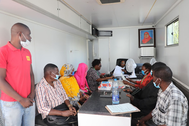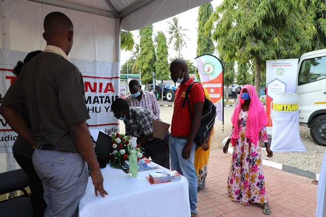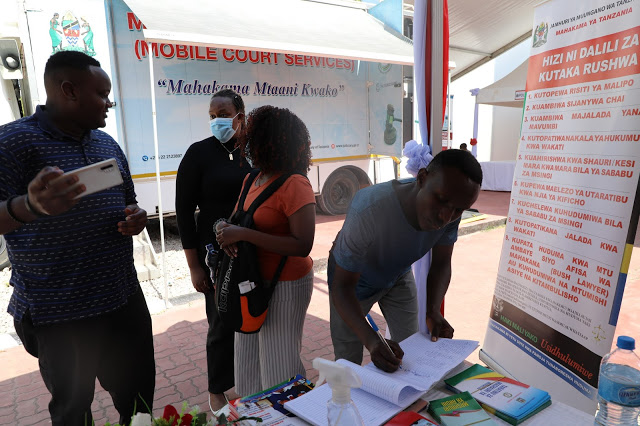 Baadhi ya wananchi wanaotembelea Mahakama inayotembea kujionea njisi inavyofanya kazi zake za utoaji haki kwenye Maonyesho ya 45 ya Kibiashara ya Kitaifa Jijini Dar es salaam